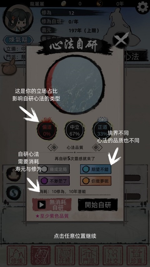 这里是你的立场占比,影响自研心法的类型;其次境界不同心法的品质也不同,自研心法需要消耗寿元与修为。