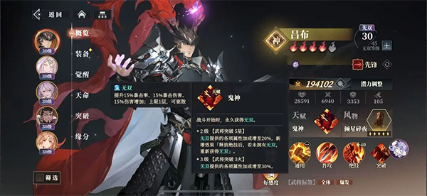 2、吕布天命的5条橙色属性分别为暴击率、防御穿透、抗暴率、吸血、破格挡率