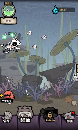 总体来说游戏的 玩法比较简单,进入游戏时,人手一只鲲,只要移动你的鲲宝宝,上下左右进行捕食,一步步的喂饱,经验蹭蹭蹭地涨,游戏右上角会显示能量条,也就是升级的进度条,而且离线也能增加能量哦。