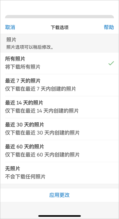 (3)对于照片,您可以下载所有照片,仅下载在过去 7 天、14 天、30 天或 60 天内创建的照片,或者不下载任何照片。有关如何使用这些选项下载和保留照片的详细信息,请参见下载的照片。
