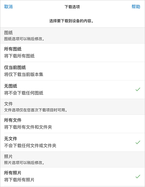 在初始项目下载后,您可以选择编辑图纸和照片的下载选项以应用于后续项目同步。