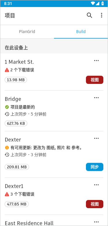 (1)可用更新:Web 上有您的设备上尚不可用的更改。单击“同步”即可接收对项目所做的更新,包括新文件、图纸和已发布的标记(如果相关)。