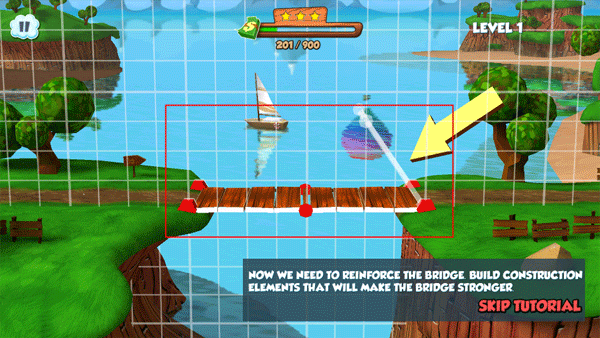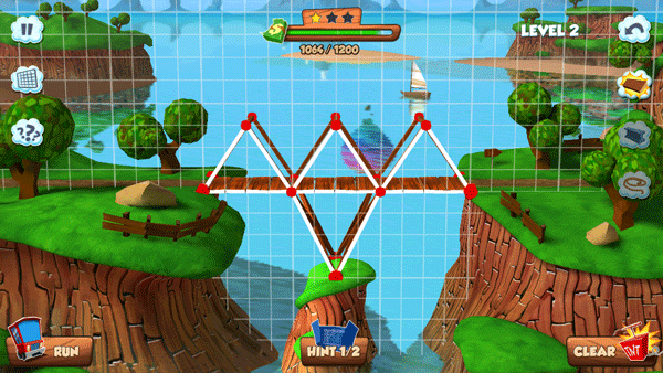 桥梁建设者模拟器手游是一款模拟桥梁建造的物理游戏,玩家必须制作一座(或多座)桥来让车辆过河,看似简单但要让桥能支撑车辆的重量并不是一件容易的事。玩家在搭建桥梁前需要注意周围各个红色支点,通过支点来搭建桥梁,如果不小心搭建错了或弄多了木板,也不用担心,你只要双击屏幕或点击“CLEAR”按钮,就可以删除多余的木板了。