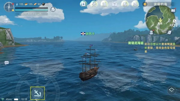 出海后,点击左下角船舵中的船锚按钮即可启航,再次点击即可停下。