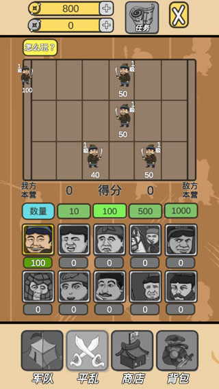 其中平乱是这款游戏主要的特色,关于游戏的初始挑战界面如下图所示,关于玩法,小编就简单的介绍以下,通过拖动兵种来将其放置在不同的行动路线中,派出之后,士兵们便会前进,并在遭遇到敌军后会自动攻击,游戏中兵种类型的丰富程度决定了这款游戏有着诸多的不同点,兵种之间的互相克制,刀克枪、枪克骑、骑克刀,但这里的甲兵不受任何兵种克制,同样也不克制其他兵种,克制关系是基础攻击力的2倍。