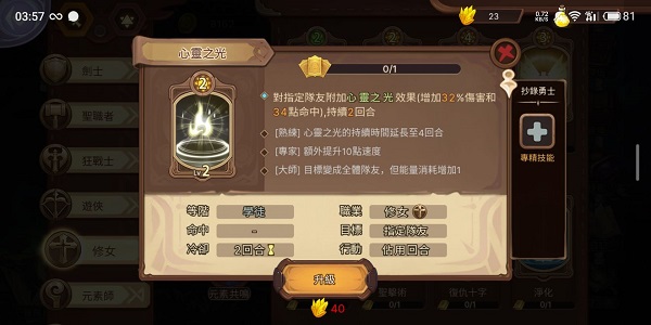 反击:反击三次,提供伤害命中加成。仅5级的反击就有了58的伤害加成,战士反击一刀一个小怪并不是难事。反击和后面烈焰盾最好有一个进阶1,最最好是反击。
