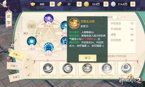 “天罡北斗阵”,说起来各位可能有些陌生,但对于急速进战的状况,却大有裨益。这是一个被动绝学,进入战斗时保证侠气值至少为80点,随着绝学升级,这个数值也会增长。因为许多主动绝学需要侠气催动,因此“天罡北斗阵”堪称百搭绝学。