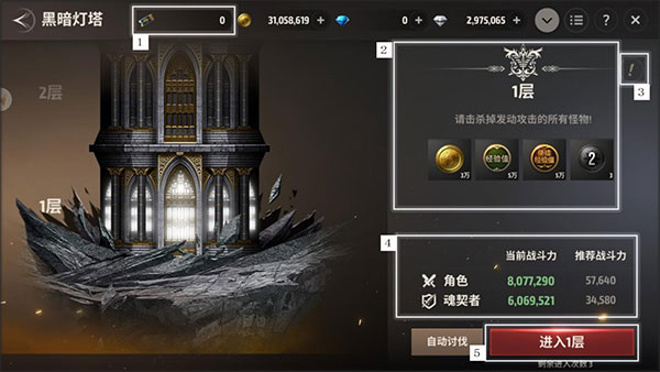 通关当前层数后可挑战下一层,塔内可获得提升装备属性的魔法石。