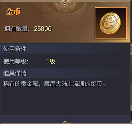 4、金币,稀有的贵金属,魔晶大陆上流通的货币,可拥有25000个金币。