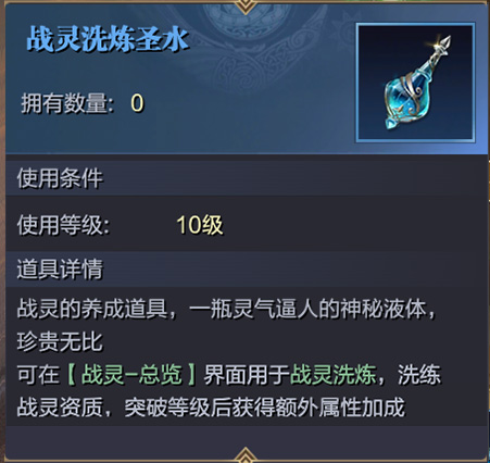 3、战灵洗炼圣水,战灵洗炼圣水10级就可以配备了,它是战灵的养成道具,一瓶灵气逼人的神秘液体珍贵无比,可在[战灵一总览]界面用于战灵洗炼,洗练战灵资质,突破等级后获得额外属性加成。