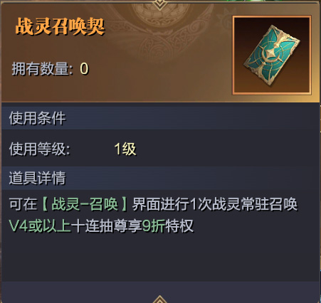 1、战灵召唤契,该道具可以在【战灵-召唤】界面进行1次战灵常驻召唤v4或以上十连抽尊享9折特权。