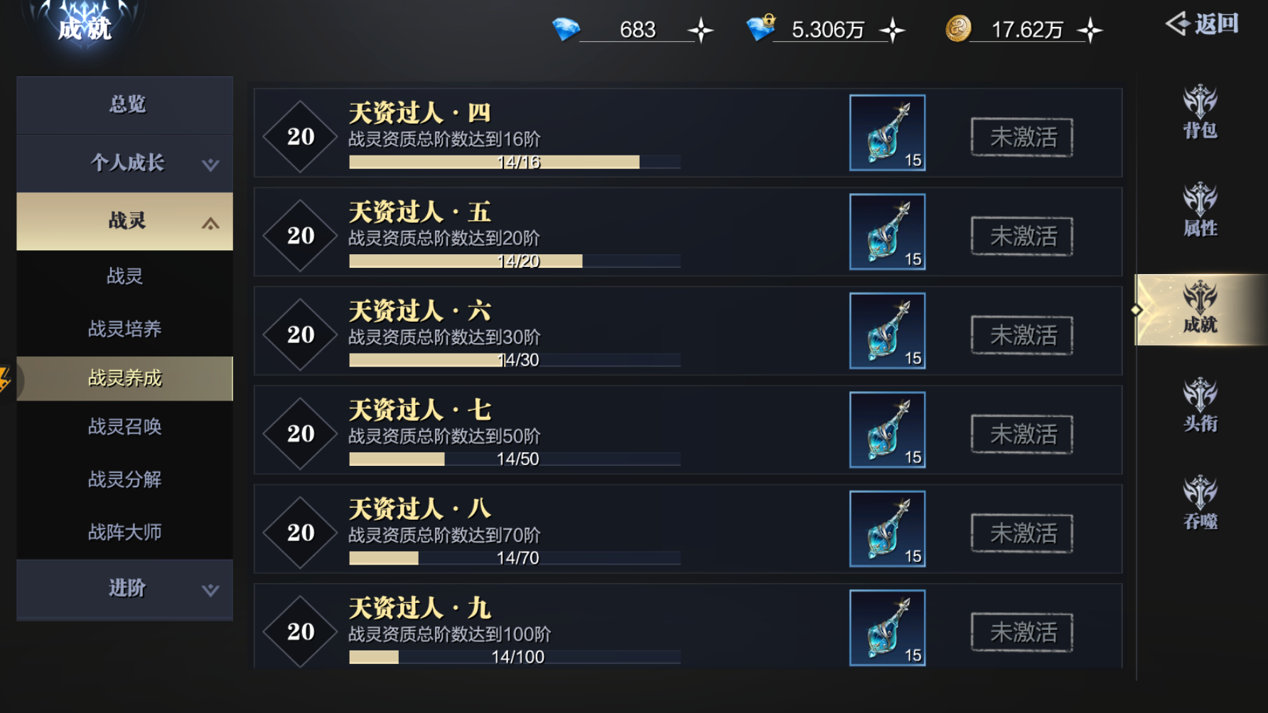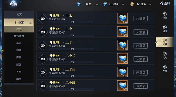 3、成就系统按照个人成长,战灵,进阶,装备,日常,限时活动、社交七大类进行了划分,每个类目下面又按照不同维度划分出了不同小标签,几乎涵盖了玩家在游戏里每一个阶段的进程,以个人成长为例,几乎每提升20级就能收获500的绑钻,在前期飞速升级的阶段,至少能为玩家提供上万的绑钻,这也意味着玩家可以用这些绑钻,购买各种礼包,道具。战力飙升的不要太轻松。