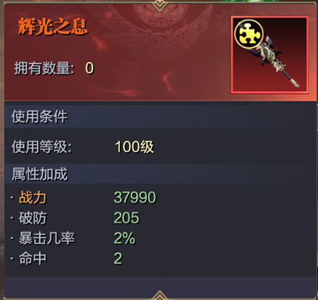 2、辉光之息,该道具可100级以上才可以配备,它可以给属性加成,使战力提升37990,破防提升205,暴击率提高2%,命中率提高2。