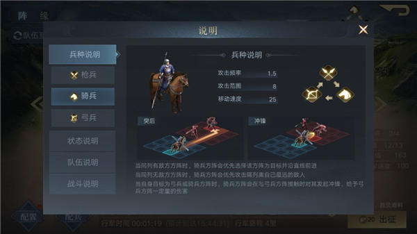 各位主公可在布阵界面看见兵种互克关系,骑兵克制弓兵,能直切后排,或者攻击邻排最远敌军;枪兵克制骑兵,最好拿来跟对面骑兵对位,如果对位无敌军,则会找最近的敌方部队;弓兵克制枪兵,是后排输出,需要注意保护。