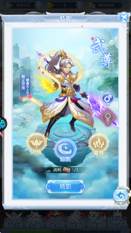 2、游戏内提供了转职系统,这里推荐大家使用武尊,连体伤害,提升也比较容易。