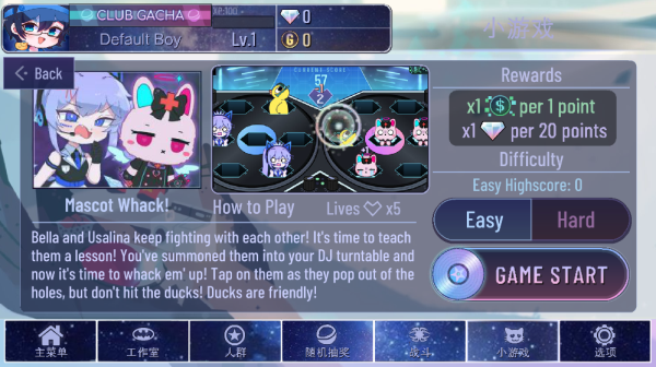与打地鼠类似的模式,在这个小游戏中Bella和Usalina会从界面中的DJ工作台上左右两个碟子中的6个孔出现,其中还包括鸭子。