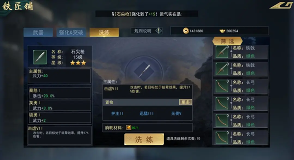 【传世打造】的装备自带特技,可以进行洗练。装备可以进行消耗洗练石来洗练,置换新的特技,达到次数上限后,将无法进行洗练。