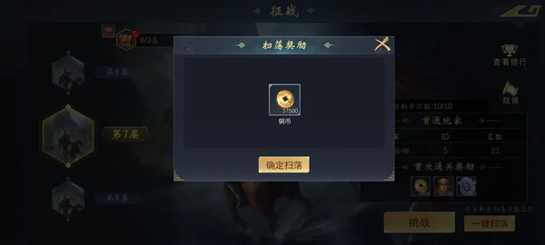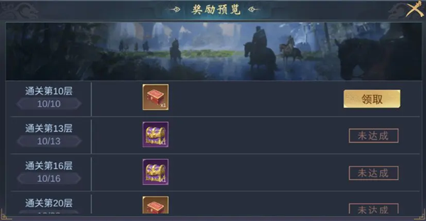 每成功挑战1层,主公都能获得首次通关奖励,失败则需要重新挑战。每达到3层或4层时,可以领取一份征战层数奖励。