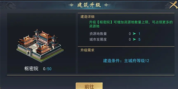 主城12级可建造的枢密院是决定的资源地可占领的数量,枢密院的等级越高,可占领的资源地也就越多。