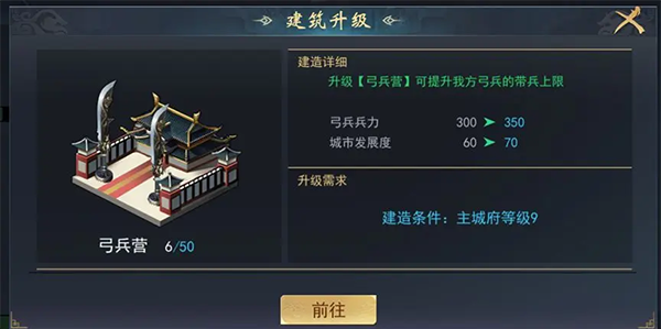 主城4级可以建造的军事建筑中的枪、弓、骑三种兵营等级决定了对应兵种武将可带领的兵力数量,兵营等级越高,所带领的也就越多,部队也就越强力。