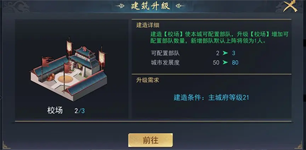 而校场也是非常重要的解锁建筑,是用于解锁第三部队的作用,非常重要!