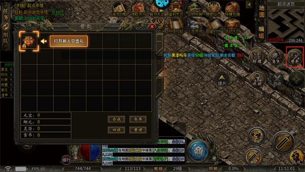 5、点击屏幕右侧的背包按钮,打开新人见面礼包;