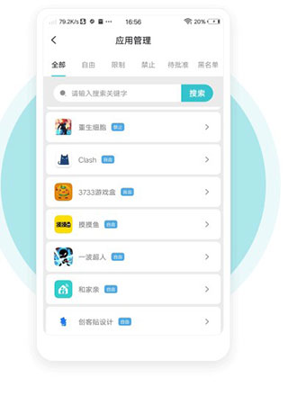 应用管理 + 应用时长设置:您可以管理孩子手机上安装的应用,并设定应用的使用时长,应用使用时间到达后,软件自动退出,防止孩子沉迷手机。