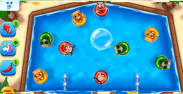 泡泡机就像一个黑洞一样,一旦有人物进去,想要让他出来的话就必须再次发射泳圈,有一个窍门告诉小伙伴们,进泡泡机后,最省步数的做法如果在泡泡机刚好瞄准泳池所有同类时,要在泳池的另一边把其他人物消除一部分!