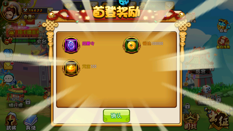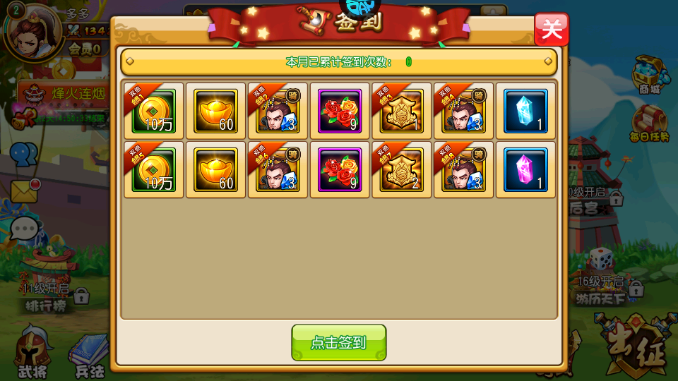 2、每日签到可以领铜钱、元宝、武将等奖励;