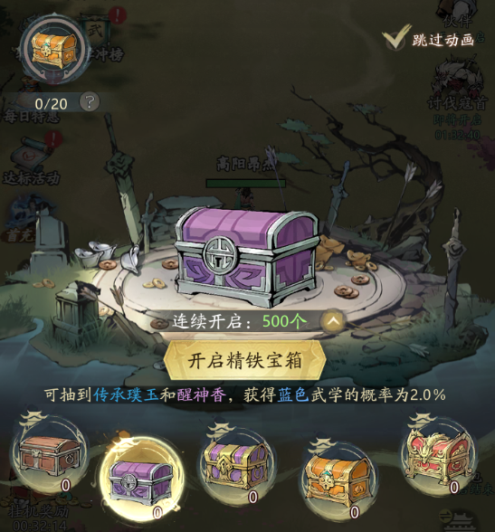 3、江湖宝箱:木质-精铁-黄铜-鎏金-珐琅,宝箱的等级越高开出的武学和奖励越好哦;同时会累计积分,达到目标后可以领取累积奖励;