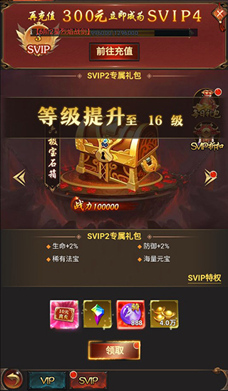 1、玩家在进入游戏之后就可以领取vip礼包,直升vip15。