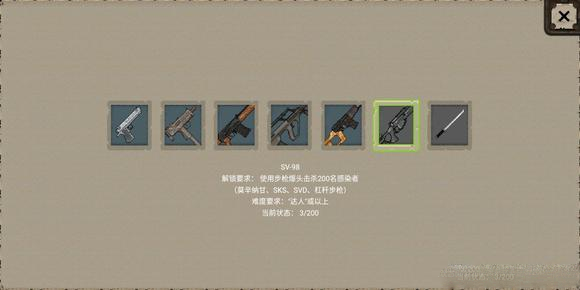 8、主武器:武器有很多,我说说个人认为比较好用的武器,ak类的武器都还不错,我个人最喜欢用的一把枪叫辛莫甘娜步枪,这把枪最高伤害能到100多,我经常爆头一枪一个匪徒。这把枪有个缺点,瞄准要很长时间。an94也不错,三连发的。gouza也不错,军事基地会刷,我捡了好几把,就是子弹不够用。冲锋枪个人感觉不太行,威力太小了。剩下几把要解锁的枪都是很不错的。