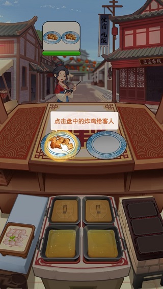 点击炸好的鸡肉放进盘子,点击盘中的炸鸡给客人。