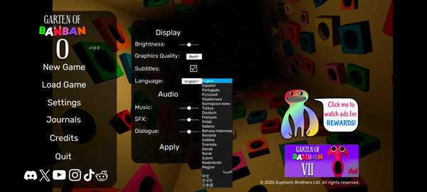 班班幼儿园0手机版是一款全新的恐怖探索解谜游戏,英文名叫Garten of Banban 0,也是《班班幼儿园》系列的第八部作品,游戏延续了一贯恐怖烧脑解谜的玩法,并且支持中文、英文、西班牙语、日语等多国语言,而且海量的交互式道具和各种头脑风暴版的难题等着你来解答。