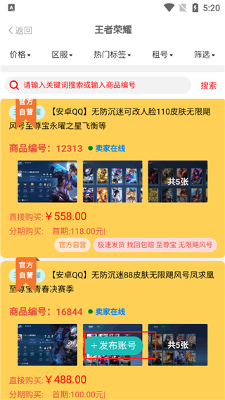 约号玩游戏交易平台是专为喜欢玩游戏的用户打造的一款安全有保障的游戏账号交易软件,更名为约号玩,为玩家提供了海量热门高端游戏账号的租赁,再加上极低的租金,玩家可以自由享受到高端账号的畅爽游戏体验。平台内的提供的游戏也非常的丰富,如王者荣耀、火影忍者手游、CF、和平精英等等上百款游戏,让玩家可以轻松体验各类游戏的高端局。软件为玩家提供了账号估价、秒收等服务,只需一键发布自己的账号,即可轻松出售自己的账号。在约号玩游戏交易中,玩家租赁游戏后,只要直接复制账号密码至游戏客户端即可进行登录,十分的方便。