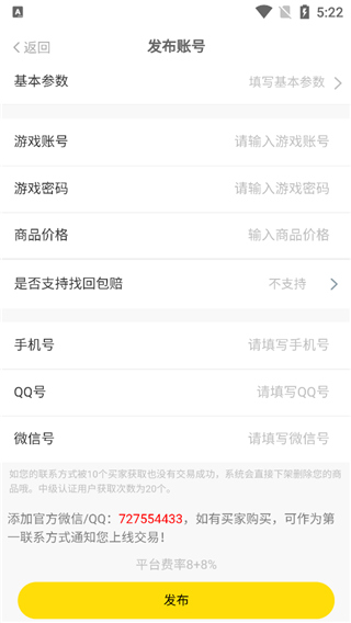 3、输入账号的详细信息点击发布即可。