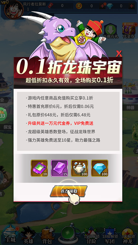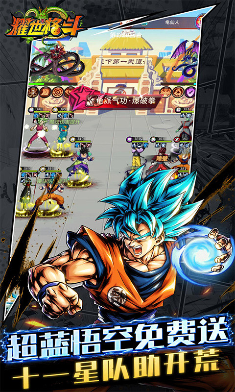 耀世格斗手机版是采用热门ip龙珠来打造的一款非常好玩的回合制战斗手游。在游戏内为玩家提供诸多七龙珠里面热门角色,无论是身为主角的孙悟空,以及他的各种超级赛亚人形态。还有强大破坏神比鲁斯和天使维斯等强力角色,玩家统统可以通过游戏免费赠送的福利道具来对他们进行抽取养成。除此之外,在耀世格斗中还玩家准备了丰厚的福利礼包,即永久0.1折特效,让玩家可以花更少的钱来购买更多的道具,还有免费领取高达1500抽抽卡卷,让玩家可以尽情抽取自己想要的角色。对此,有喜欢的玩家欢迎来本站免费下载体验。