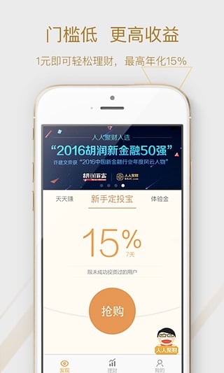 人人聚财拥有多重安全风控系统,绝对保障用户的账户资金的安全,同时平台内的理财产品投资期限灵活,投资门槛低,1元即可体验理财,想稳当拿收益的亲们一定要下载体验哦!
