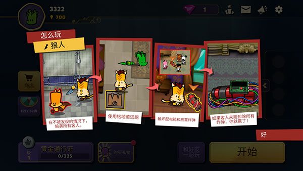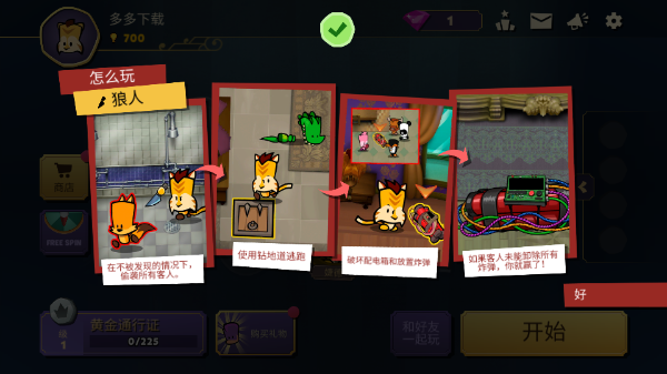 在不被发现的情况下,偷袭所有客人-使用钻地道逃跑-破坏配电箱和放置炸弹,如果客人未能卸除所有炸弹,你就赢了!