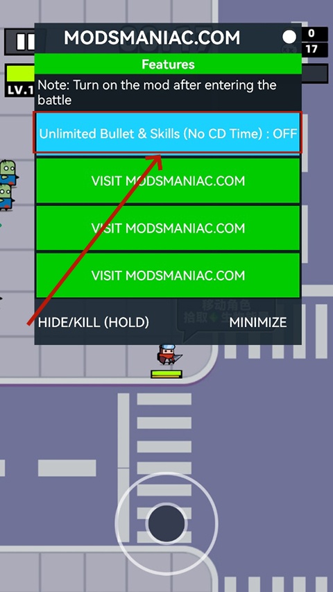 3、点击打开内置作弊菜单,在【Unlimited Ammo & Skills: OFF】这一行点击OFF切换为ON,无限弹药和技能模式就开启了。