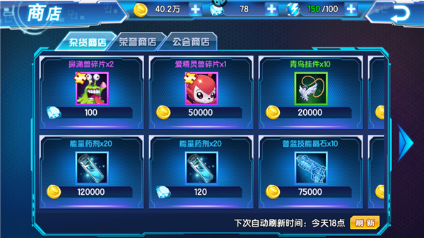 4、商城:每天在商店内都会随机刷新数码兽碎片,玩家可以花费金币、荣誉等进行购买。特别要说的是神秘商店,里面出现数码兽碎片的概率非常大,不过神秘商店只会出现一会儿,过了时间就会消失了。
