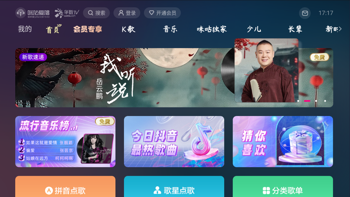 2、然后点击k歌,支持拼音点歌、明星点歌,还有免费歌曲供用户们体验;