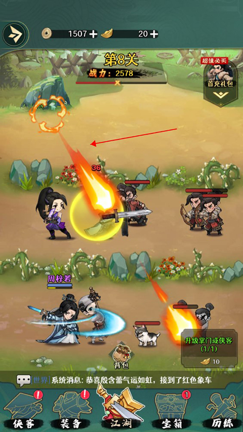 1、游戏以主线玩法为主,侠客们会自动战斗,击退敌人,玩家点击主线任务完成即可。