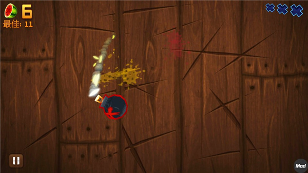 5、图标为香蕉的Arcade是最新的一个模式,也称街机模式,是花样最多的一个模式。在本模式中会同时出现炸弹和水果,时间为1分钟。切到炸弹会扣除一定分数,切到三个特殊香蕉有另外的奖励。红黄香蕉(狂热状态)、冰香蕉(冻结时间)、蓝香蕉(双倍计分)如何利用好这三种特殊的香蕉正是这个模式的关键。