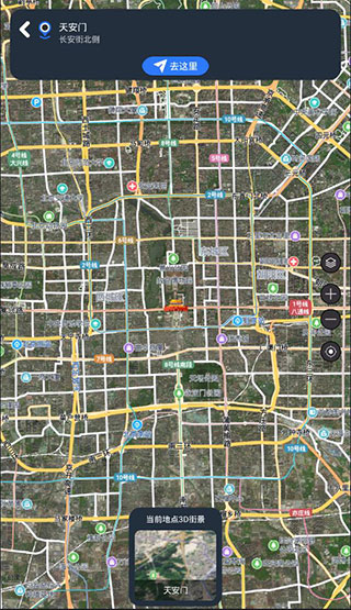 5、在用户进行完搜索以后,会进入地图页面,以天安门为例,你可以看到附近街景总览,点击右边的+/-,可以进行地图的放大缩小。