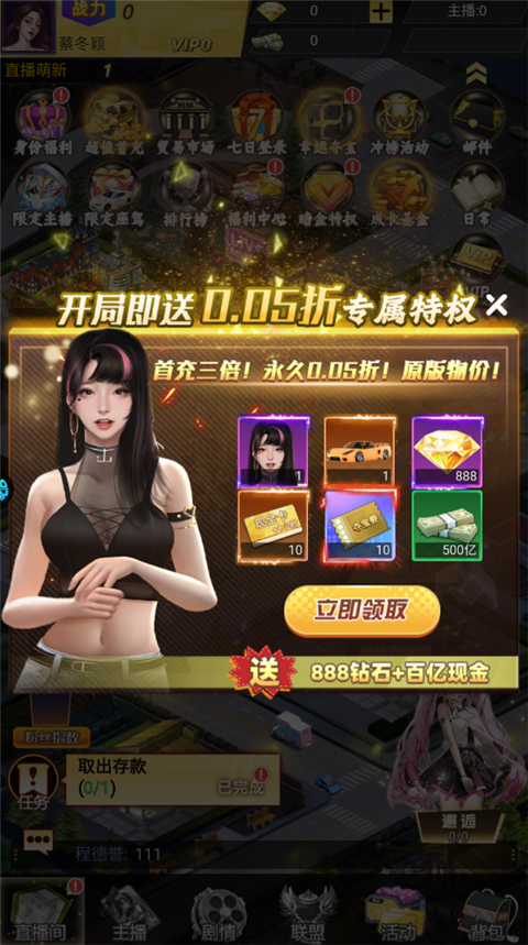 3、0.1折福利,女神主播免费领,每日登录即领取,通关主线轻轻松松。