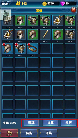 6、而点击背包则可以看到我们所获得的装备图鉴,你可以将其装备,也可以整理,更可以将其分解;