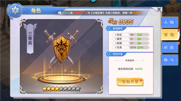 玩家达到等级即可升级军衔提升属性。