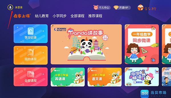 3、成功登录之后就可以免费观看全部的学习课程了,可以看到上面有在家上课、幼儿教育、小学教育、全部课程、推荐课程等学习内容,并且还分为了VIP课程和免费课程;
