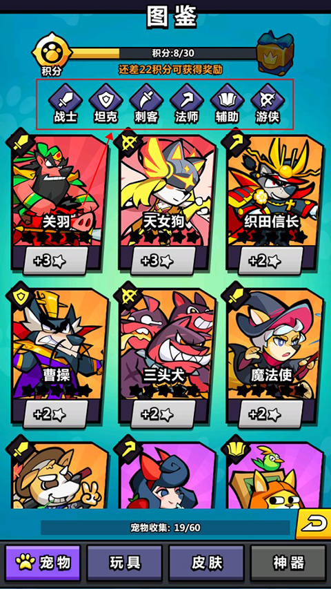 1、游戏内有着丰富的宠物英雄,分为战士、坦克、刺客、法师、辅助、游侠六种职业。